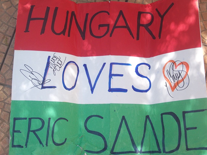 "Ezutn Eric lement a szpadrl, mi pedig ldrgtnk egy darabig a parkban, esponcst keresve, ugyanis addigra mr mindnyjunk brigzott. A fprba ngyrakor kezddtt s ezt mr szknkn lve hallgathattuk. Egyszeren csodlatos volt! Molly hangja sokkal gynyrbb lben, mint Tv-n keresztl, s Molly sokkal jobban nekel lben, mint Tone. Amikor az Imagine-t kezdtk nekelni, mi Saadistk krbelltuk a sznpadot s siktozva integettnk Ericnek s nekeltnk. Eric nagyon sok figyelmet fordtott a klnbz tblkra s termszetesen a magyar zszl szemet szrt neki is s mg puszit is dobott. A soundcheck s az l show kzt mindent megtettem, htha bejuthatok backstage-be (ami sajnos nem sikerlt) Mollyhoz vagy Erichez, de mint kiderlt arra a kt rra az sszes nekest elszlltottk egy hotelbe. Mieltt a Tv kzvetts kezddtt volna a fszervez feljtt a sznpadra s felolvasta az sszes tblt, gy az enymet is, s tbbezer kvncsi tekintet szegezdtt rm, mint a lnyra, aki ennyit utazott csak Eric-rt. 8-kor vgre elkezddtt a Lotta på Liseberg s el kell, hogy mondjam, hogy mr az elejtl nagyon jl reztem magam. Ugyan Eric mg ekkor nem lpett fel, de a kzs neklsnek s az egsznek meg volt egy nagyon fantasztikus alaphangulata s ott volt a levegben az sszetartozs rzse. Termszetesen nem kellett sokat vrnom, mg megjelent Molly, hangjval elvarzsolva a kznsget. Hihetetlenl j volt, s br eleinte mg annyira nem voltam rajongja, ezek utn mindenkppen az vagyok. lben a hangja egyszeren csodlatos! Teljesen olyan, mint a stdi verzija a szmainak, ergo egyltaln nincsen feljavtva hangmrnkk ltal! Ugyanezt sajnos nem mondhatom el Tone-rl, akinek az egsz szm alatt rengetegszer megcsszott vagy megremegett a hangja s nem egyszer segtett be neki Eric, hogy kinekelje a magas hangokat. s Eric...mit is mondhatnk? A hangja egyszeren fantasztikus! Hallani tle az Imagine-t lbe egyszeren hihetetlen volt, s mg utna is szinte sokkos llapotban voltam. Egsz vgig siktoztunk a tbbi Saadistval. Ezutn jtt Tone a sajt szmval s ugyan nem kzvettettk, de Molly arckifejezse meglep volt. Morcos, majdnem, hogy undorod arckifejezssel hallgatta vgig(mondjuk megrtem, Tone-nak szerintem is rengeteget javtanak a stdiban a hangjn s az lben visszat)...persze idnknt feltnt neki, hogy lehet, hogy ppen t is veszi a kamera, akkor mosolygott egy kicsit s megigazgatta a hajt. Volt egy olyan rzsem ,hogy nem kedveli Tone-t, de persze ez csak egyni vlemny a tapasztalataim s megfigyelseim alapjn. Amikor Tone a kznsggel egytt nekelte a „Jag kommer” c. szmot ht az nagyon hzs volt. Nem tudom, hogy ti mennyira hallotttok a webtv-n keresztl, de azokon a rszeken, ahol a szm felment nagyon magasra egyszeren elcsszott s megcsuklott a hangja. Valahol a kzepn egyszer csak szrevettem, hogy mintha egyre jobb lenne, st egsz jl hangzott, amikor felnztem a sznpadra s lttam, hogy Molly rsegtett...ezt inkbb nem kommentlom, mindenki vonja le a sajt kvetkeztetseit. Ezek utn ment tovbb az egsz nagyon j hangulatban. Eric-nek nem mertek adni allsångot(egyttnekls dalt) mert fltek, hogy, ha lejn a kznsg sorai kz tbbet nem jut vissza a sznpadra. n ezt teljesen megrtem, mivel volt nhny nagyon rlt rajong is. A finlkor trt vissza jbl Eric a sznpadra s elszabadult a pokol. Mindenki a sznpad szlhez rohant s ktsgbeesetten prbltk legalbb megrinteni Eric-et. Ekkor trtnt az, hogy Eric ledobta a csokrt, gondolom, hogy elterelje a figyelmet magrl, mg a biztonsgirk odartek, de ezzel csak rontott a helyzeten. Mg ti is lthatttok az arct a vgn, amikor rjtt, hogy ezt nagyon nem kellett volna. Tmegverekeds trt ki, amibe szerencsre n nem kerltem bele. Ekkor odajtt Molly is a sznpad bal szlre s t is majdnem ugyanakkora rlt siktozs fogadta, mint Eric-et. Pr perc mlva Eric is odajtt Molly-hoz s ekkor kezdett vette az egyms fellkse s a flrepeszt siktozs. Eric tlelte Molly-t, aki belesimult a karjaiba. Nagyon desek voltak! Ezutn lementek a sznpadrl s mindenki megrohamozta a sznpad melletti paravnsort, ahova meg volt grve, hogy jnnek autogrammot osztogatni, de azt mondtk, hogy ne igazn szmtsunk arra, hogy Eric ki jn. E miatt megkrtem az egyik fszervezt, aki arra lzengett, hogy tegye le az Unicum-ot s a levelet Eric ltzjbe, aki eleget is tett krsemnek s lthatttok Instagram-on a kpen, hogy Eric megkapta s nagyon rlt is neki. Ksbb, annak ellenre, hogy mit mondtak a szervezk ki jtt Eric autogrammot osztogatni egy hatalmas biztonsgi r ksretben. Minden rajongjnak alrt mindent, amit szerttek volna s amikor oda rt hozzm tudtam is vele pr szt beszlni angolul (most magyarul rom le, csak, hogy mindenki rtse: n:”Itt vagyok Magyarorszgrl... megint”Eric(egyszerre velem): ”Megint”...”Ltom”n:”Magyarorszg szeret tged!”Eric:”Ksznm, hamarosan ott leszek!”n: „Csak miattad jttem el Gteborgba” Eric:”Ksznm, hogy ilyen sokat utaztl miattam, remlem, hogy hamarosan jra ltjuk egymst!” ...ezutn ment tovbb autogramot osztogatni, amikor egyszer vgigment a soron mg szeretett volna tenni egy krt,de a biztonsgir meglltotta s sz szerint visszalkdste a tiltakoz s kaplz Eric-et az ltzjbe...seggfej biztonsgi r! Ezutn kijtt Tone, aki konkrtan akrki, akrmit mondott neki semmit nem reaglt, csak fapofval osztogatta az autogrammot (s ezt nem azrt rom, mert nem igazn cspem, hanem tnyleg gy trtnt). Mikor mr hatodjra kiabltam neki, hogy „Tone gyere Magyarorszgra!” Akkor mondott annyit, hogy „Jah j lenne!” de kb. ennyi volt, taln vgzett a leghamarabb az autogram osztssal. Utna jtt Molly, akinek szintn adtam ajndkot (Trrudit s Bocicsokit) s vele elgg sokat tudtam beszlni, nagyon kzvetlen s kedves volt. Csinltunk egytt kpet, majd megleltk egymst s sszedrgltk a fejnket! Molly hihetetlenl aranyos volt, mindenkivel csinlt kpet, aki szeretett volna.. Este tizenegykor indultam haza, fradtan, hesen, szomjasan s csuromvizes gatyval s cipvel de rengeteg fantasztikus lmnnyel."