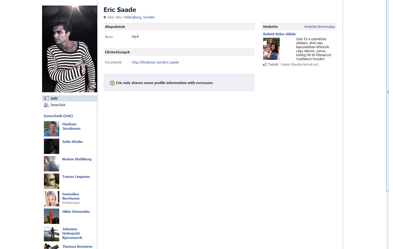 Tegnap Melivel rtalltunk Eric sajt, igazi facebookjra. Sajnos zenetet kldeni nem lehet neki, s az egsz adatlapja titkostva van, mg bejellni sem lehet. Hogy honnan tudjuk, hogy az igazi Eric? 646 ismerse van igaz, az nem kevs. Ugyan akkor, abban a hatszz ismersben, ott van desanyja desapja , Lina (a legidsebb testvre) s J-son is.